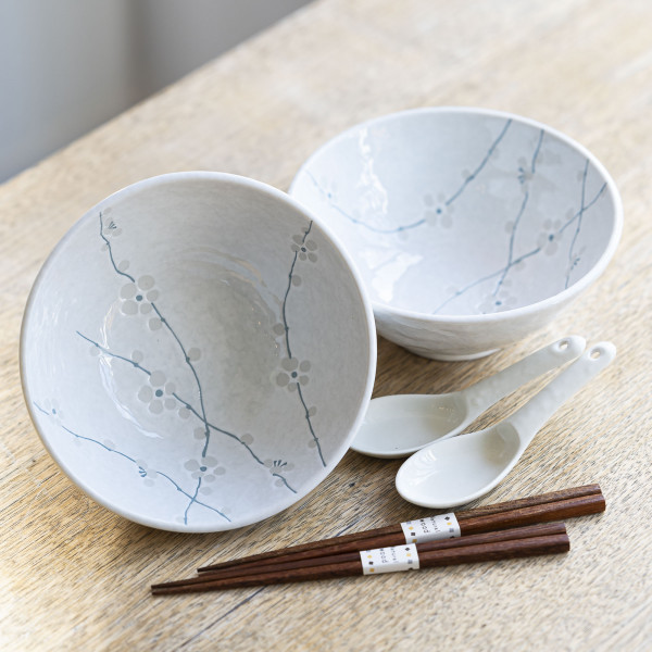 We have 2x White Blossom Udon Bowls, 2x Wooden Chopsticks and 2x Ceramic Spoons to giveaway – together valued at $100.