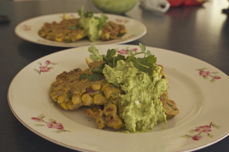 I managed to convince a couple of friends that were free over Easter to come and help and we took turns chopping apples into insinkerator-able sized pieces and discarding any really gross bits of apple, or took on the mildly scary task of feeding the insinkerator. In a bid to keep my cider slaves happy I made them some gluten free corn fritters from the Kenko Kitchen cookbook, slightly modified to use a real egg and cheese in the avocado smash.