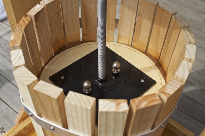 After the apples were passed through the insinkerator the pulp was put into the muslin cloth-lined barrel. When it was full, a wooden disc was put on the top and I wound the threaded rod down. My brother had welded a bolt to the top of the rod so I could use a power drill to wind it up and down quickly before moving to the hand crank for the pressing.