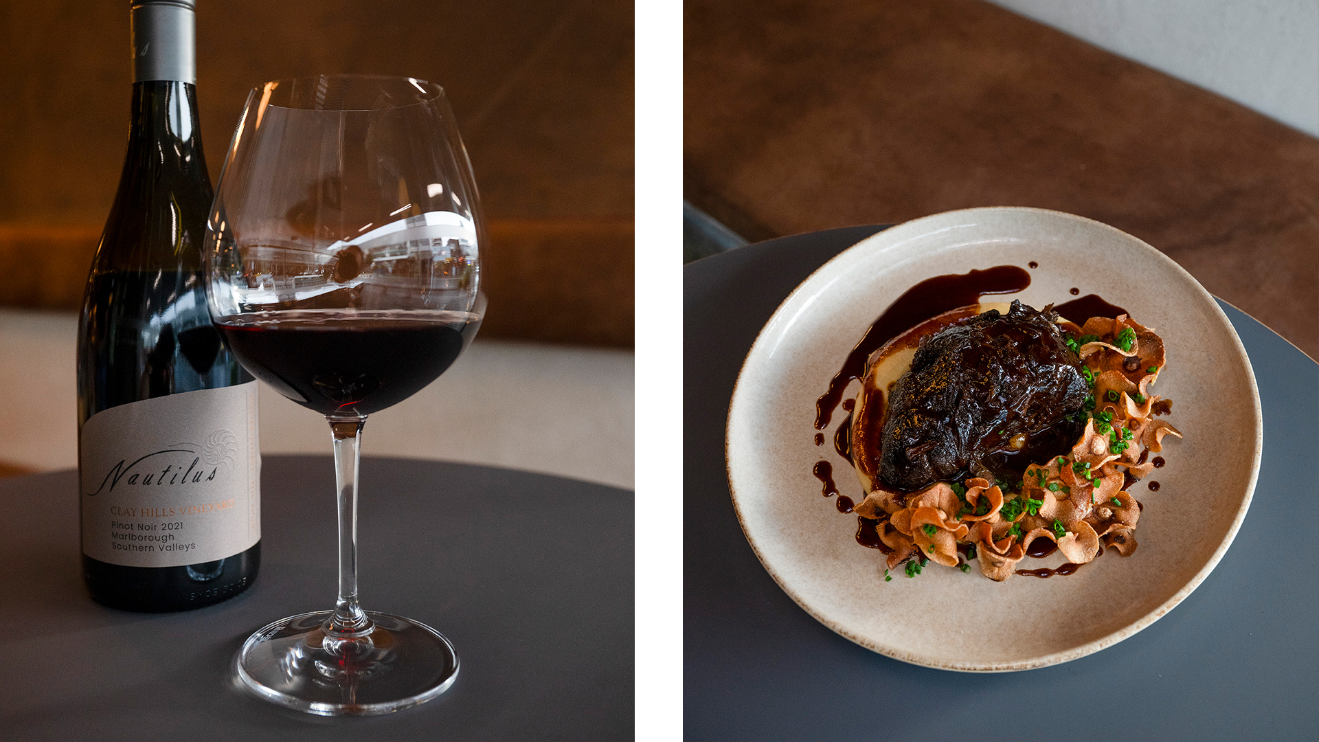 The evening began with a perfect single prosciutto croquette and a glass of the Nautilus Vintage Rosé 2021 served — as with all wine during the evening — in stunning RIEDEL stemware, as Clive reflected on 40 years of New Zealand winemaking and the part that Nautilus has played in that history. Fantin gave us a hint of what more was to come on the menu, to whet our appetites and provide context for his inspiration. Croquettes were followed by outrageously good ‘bread and butter’ with three kinds of flavoured butters, before the Market Fish Crudo and Tarte Leek Fondue. The crudo was light and fresh with a richly earthy beetroot relish and silken carrot velouté, paired beautifully with Nautilus Chardonnay 2023. Described as ‘straw-coloured with aromas of ripe nectarine, brioche, beeswax and toasted almond,’ it was elegant and delightful.