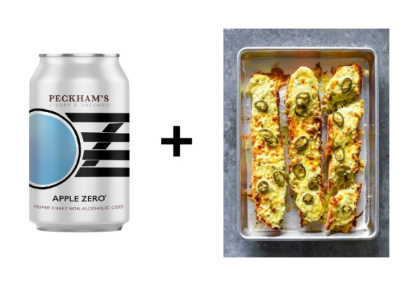 Apple Zero Peckham's Cidery & Orchard Non-alcoholic Cider Caramelised apple notes and the rich texture of this cider cut through the on-the-nose heat of our Jalapeño Popper Garlic Bread. | ![]() |