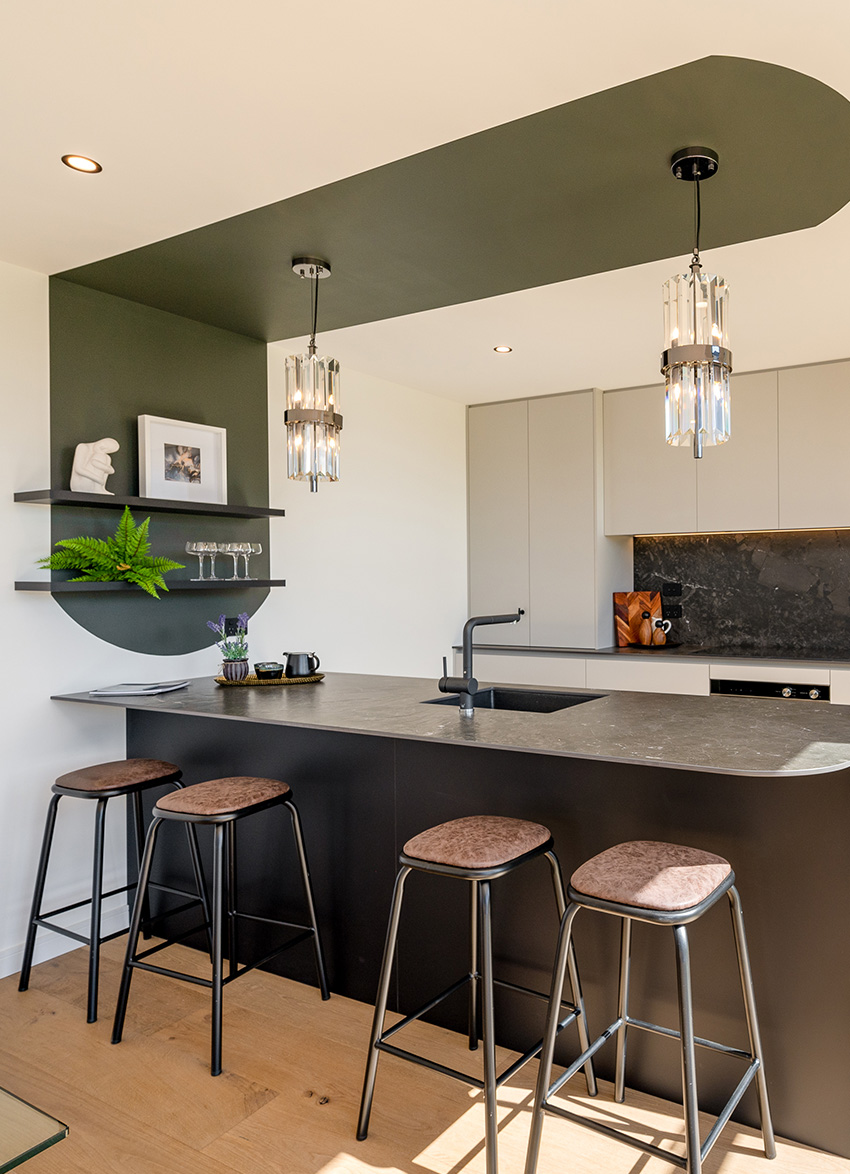My favourite part was using the bold green colour to create an eye catching anchor for the pendant lights. It allowed us to continue to reflect the overall design inspiration through the kitchen, while creating a very interesting feature just using paint. By keeping the rest of the kitchen neutral, they eye is drawn to this bold feature.