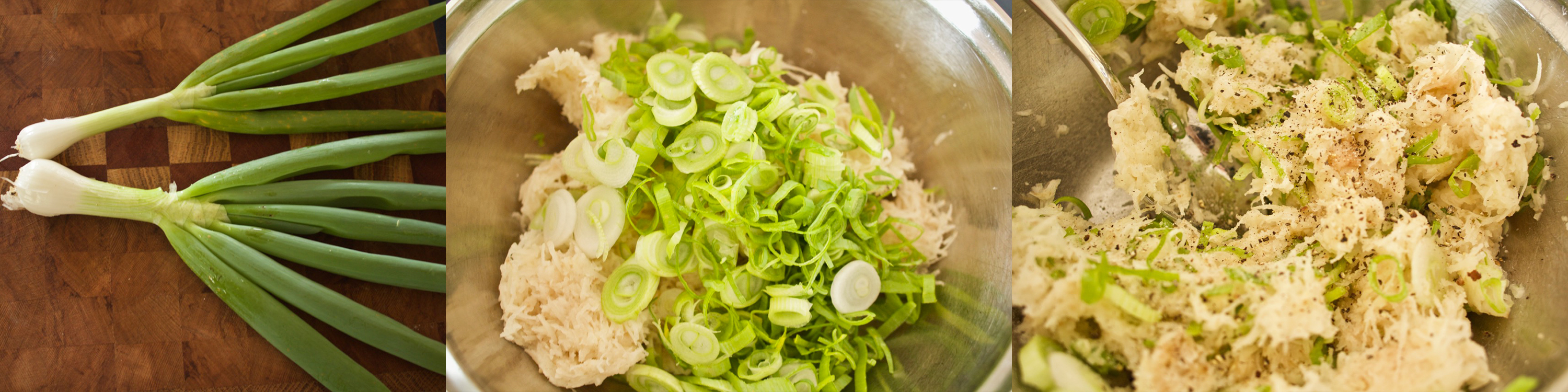 Then I sliced the spring onions finely and mixed the two together with salt and pepper. I divided the mixture and fried the potato pancakes in butter and oil for 4–5 minutes per side.