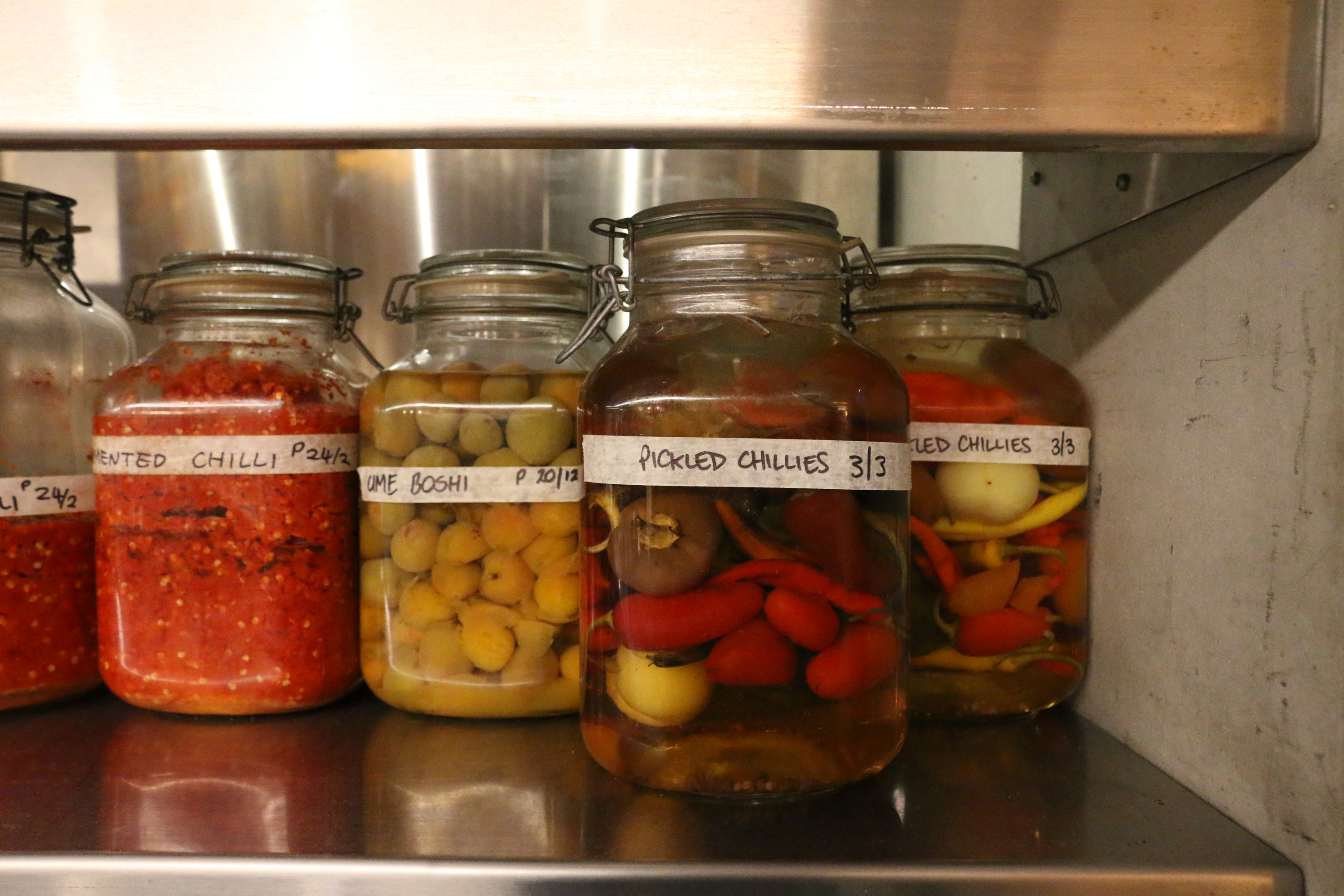 Though it's clear he gets along really well with the team at Ozone, and the collaboration is a product of friendship, after the interview, Carlo goes over to the kitchen where shelves of preserves are lined up. "This is why I chose to work with Ozone," he says, gesturing to the jars of pickled chilli, vinegared persimmon, fermented chilli sauce, preserved lemon and ume boshi. "They don't make a big thing about it, but they put a lot of effort into sustainability and reducing waste. They use what they have."