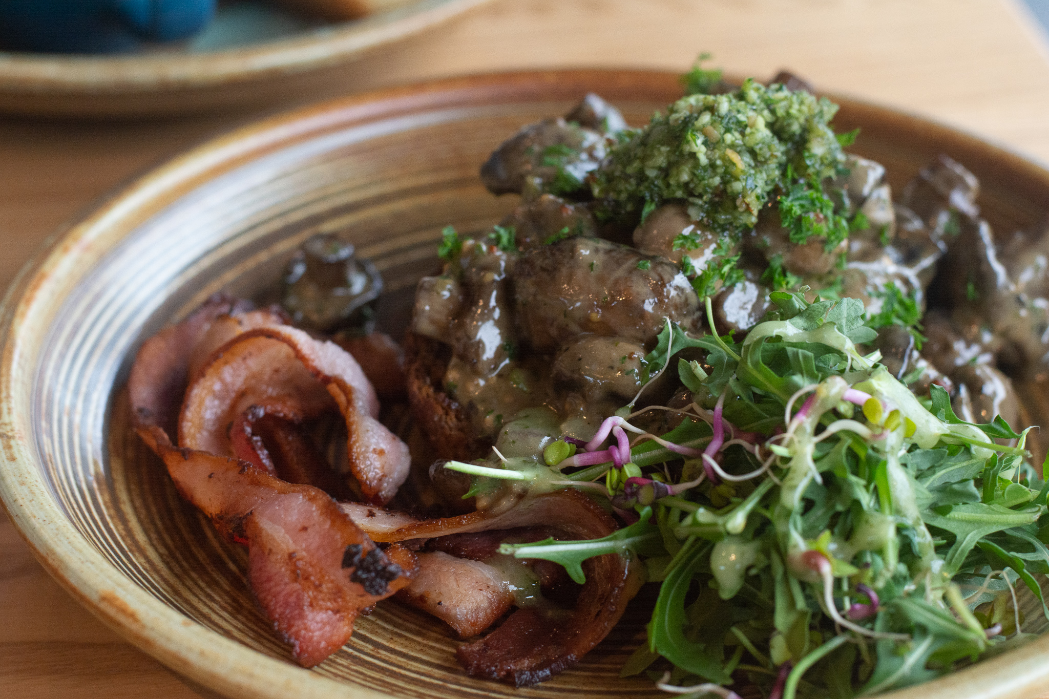 Our breakfast plate, and roast mushrooms - from the regular brunch menu - were beautifully presented. The breakfast plate had great textural variety with the crunch of the granola contrasting with the soft fruits and onion jam - exactly what you want. The roast mushrooms in particular stood out though; considering that “creamy mushrooms” are a part of most brunch menus, the added extras in this one, like “porcini dust”, were appreciated elements that can really punched the dish up a level. The chefs also managed to balance that fine line between the creaminess of the mushroom sauce and the taste of balsamic - in many cafes and eateries you'll be hit with a tart punch of balsamic far too hard - but here they really nailed it.