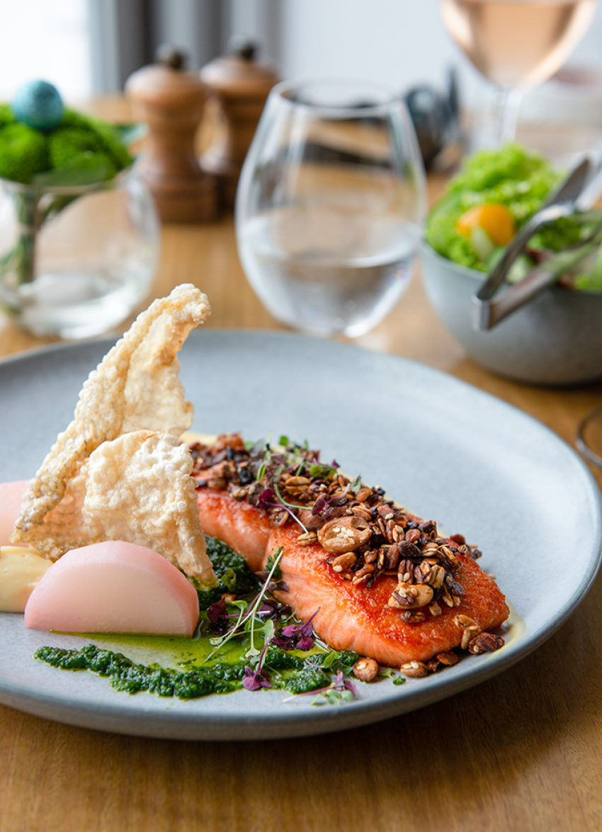 My friend and I settled in to check out the menu and had a difficult time choosing, given the array of options available. I tossed up about trying the Lobster roll with white kimchi, lemon, herbs, pancetta chips and smoked hollandaise (which sounds utterly delicious) but couldn’t go past the Big Glory Bay Salmon with swede, nori granola, ginger daikon and aillade. The salmon was beautifully cooked, tender and luscious, with a beautiful sweep of soft swede and pieces of gentle ginger daikon. The nori granola was intriguing – providing a textural crunch to contrast the rich softness of the salmon. To drink I had a glass of the 2013 Grewacke Riesling (I’m a total sucker for Riesling) and my friend enjoyed a glass of the Wooing Tree 2018 Rose. To eat she chose the Cloudy Bay clams with apple cider, dashi, bonito, lardo di colonatta, garlic chives and seaweed. She declared it to be beautifully tasty, with plump clams and a perfectly pitched ‘broth’.