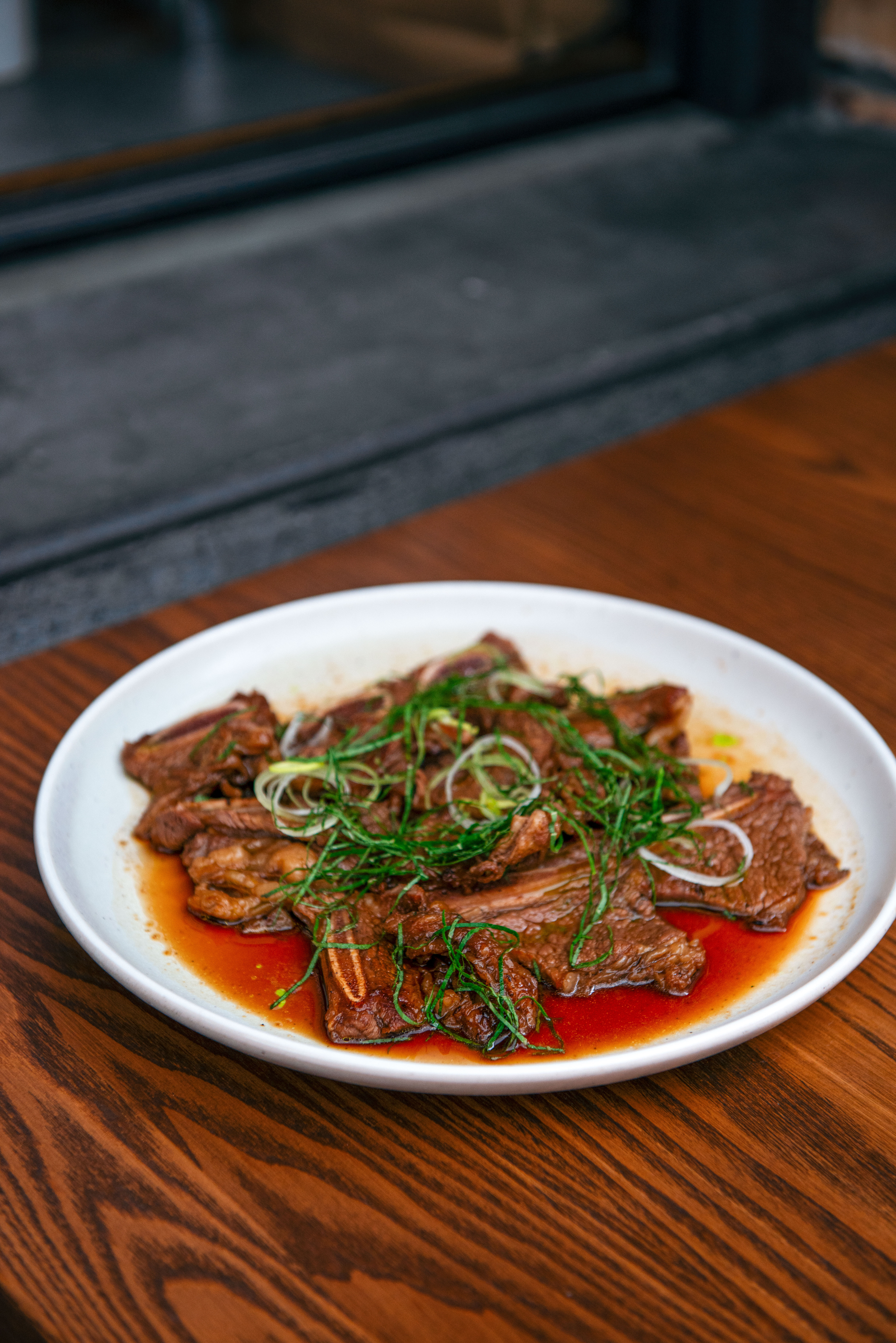 We were only just getting started, and dug into Jason’s spectacular fried chicken as if we had never seen food before, crisp and crunchy on the outside and tender on the inside it was a sure-fire winner. The milk buns stuffed with spicy chilli pork were unbelievably good dipped into a beurre blanc on the side, reminiscent of Chef Jason’s childhood we were keen to see what else had inspired him from his bank of food memories! Guests also had the opportunity to try Grilled Prawns with fennel, cucumber and Korean mustard and Roast kumara with kimchi, cheese emulsion and kumara crisps, Cloudy Bay clams, pancetta, soojaebi and potato and the beautiful Grilled short rib (LA Galbi) with perilla and leek (below).
