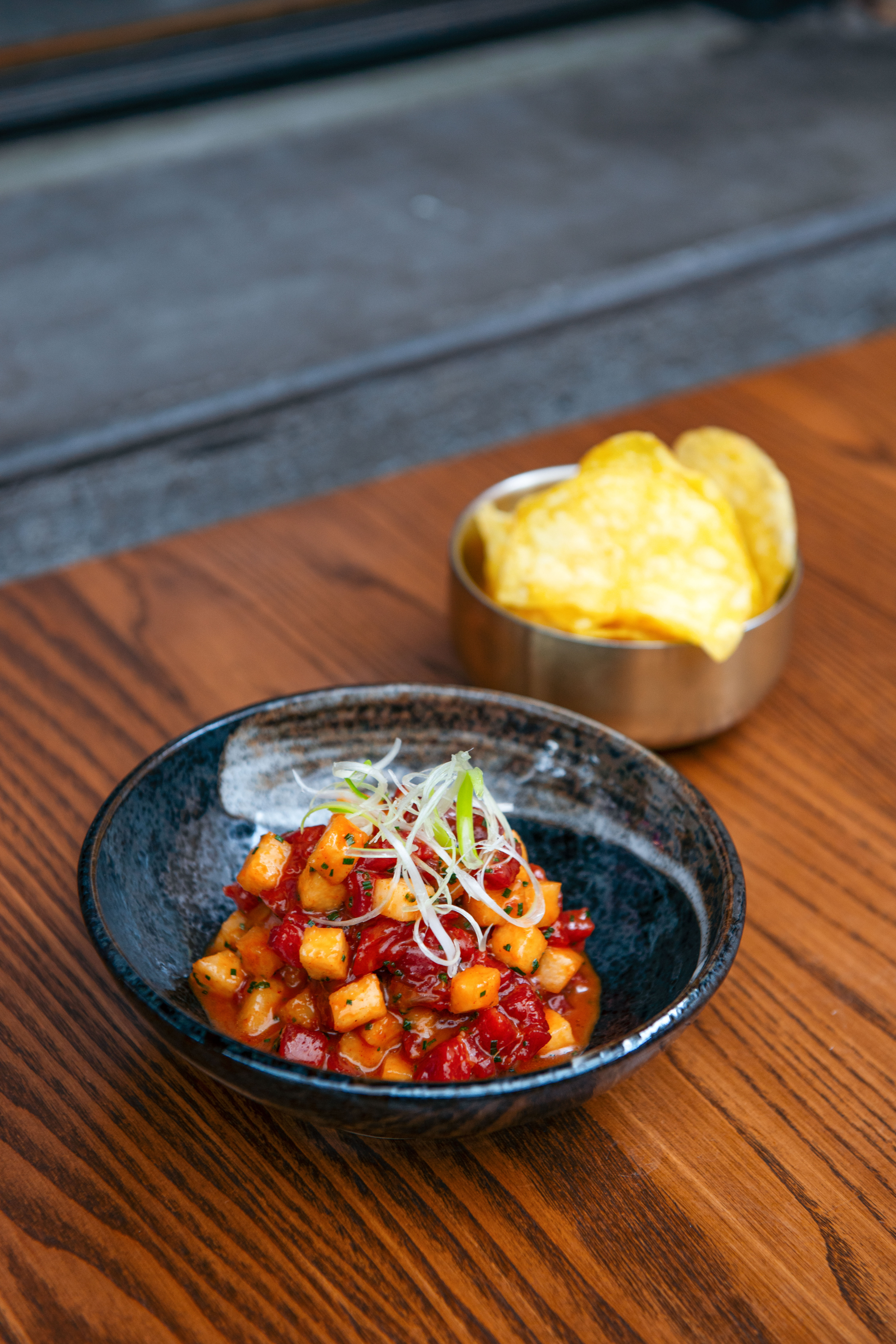 Next up was the Yukhwe, raw beef with egg yolk, pear and potato crisps – not an obvious combination to be sure, but one that worked beautifully!
