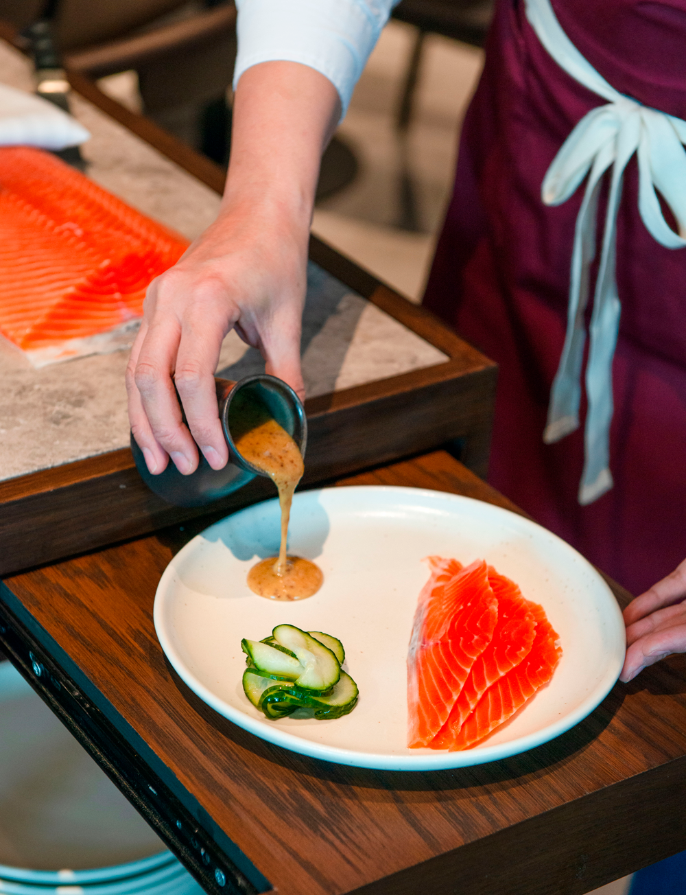 Order the Big Glory Bay Salmon Gravadlax and it will be brought to you on a trolley and carved fresh onto your plate from a slab cured in salt, sugar and citrus then served with pickles, the traditional Nordic accompaniment of honey mustard sauce, and rye bread. It's simple, and looks almost stark on the plate, but there isn't much room for improvement. Take a bite and any salmon fan will have to be careful not to fall out of their chair.