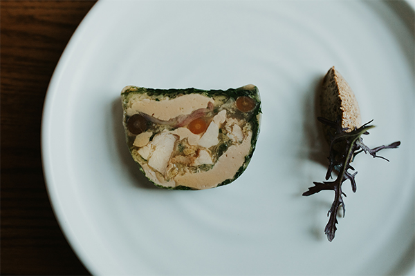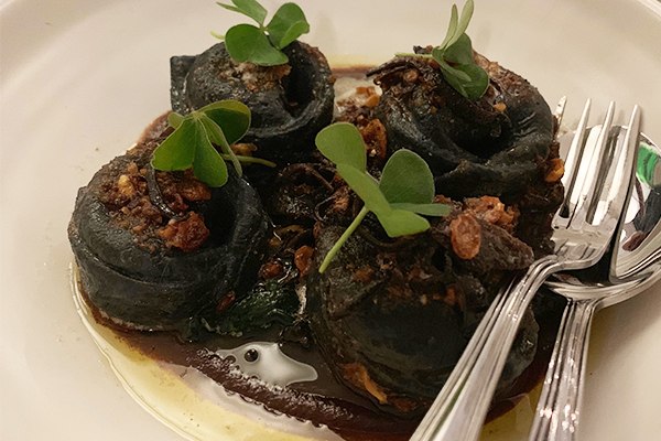Our server Briar takes us through the extensive menu. It’s Italian fare but not as you know it – if you’re thinking a pile of spaghetti and pizza, think again. The menu is elegant and well considered. It’s almost a little overwhelming, so we take Briar’s recommendation and order Fangiano Terrina: a pheasant and duck terrine with sour dough, pistachio mustard and savoy mustard. We also order Tiny Ravioli En Brodo, Smoked Havoc Pork Back with Fried Bull Kelp and Rainbow Chard.