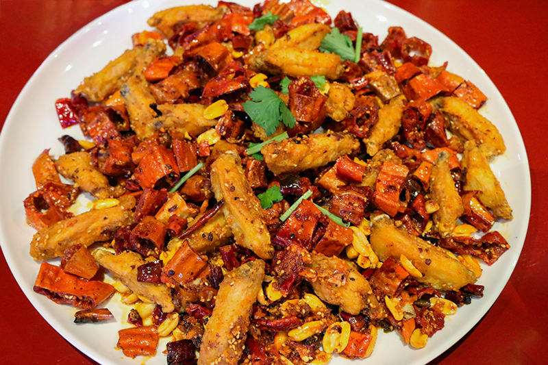Think of the biggest plate you’ve ever eaten off. These specialty dishes are that big - or bigger. They are meant to be shared. Both the spicy 'numbing fried' chicken and the chicken wings are delectable, but spicy. The wings are decadently juicy and mild enough that you’ll be able to handle them but for the numbing chicken, mild butter chicken eaters need not apply: it's seriously spicy. There's also a large seafood dish which is as mild as the wings too, but each of these large dishes are all quite different from eachother.