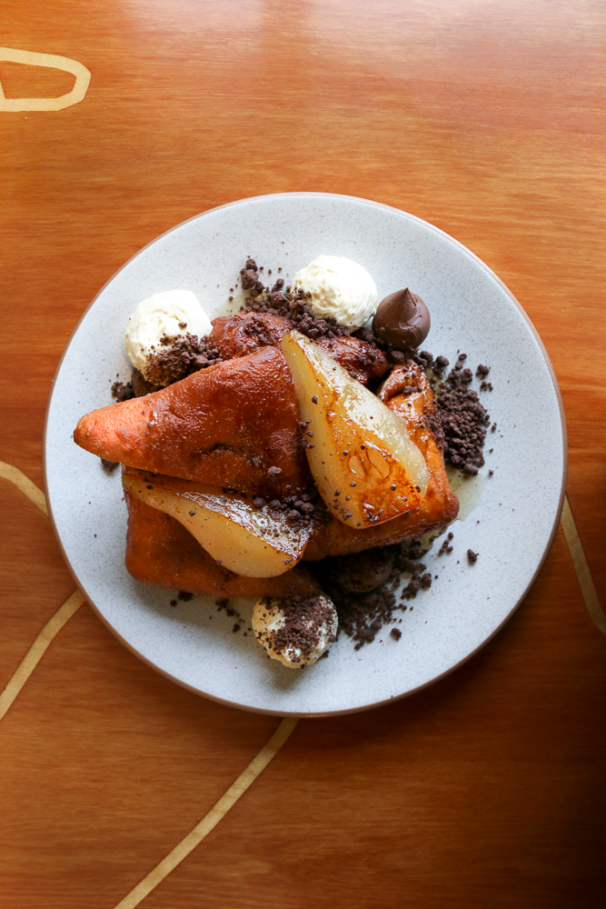 Be warned, once you have this fry bread, you'll want more. It's light, puffed up and covered in a slightly cinnamon and sugar coating and is served with roasted pears, dark chocolate creameaux and light-as-air banana cream. Plus plenty of maple syrup. The elements of banana, chocolate, and the slightly caramelised puff of bread each add a piece of perfection.