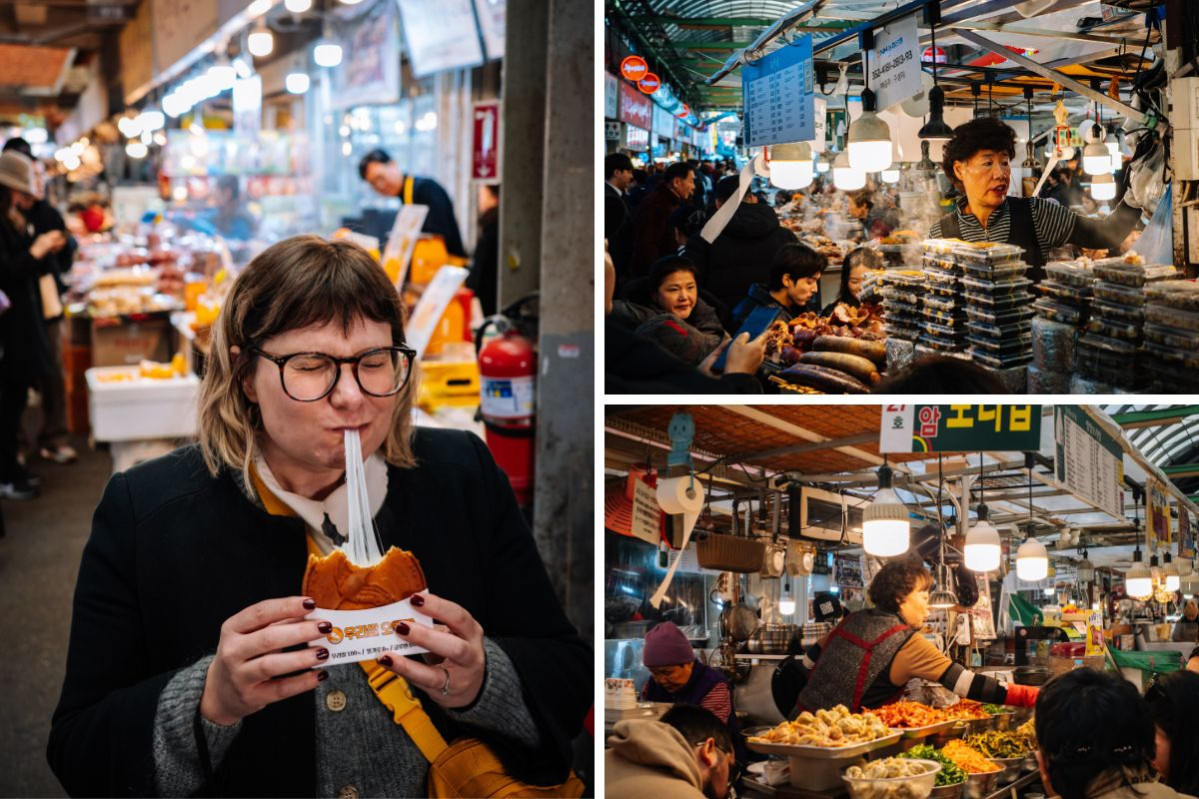 Maybe I am just easily impressed — and/or the endorphins from having a good snack in hand makes it hard for me to be critical — but I loved every market we visited. There is always something delicious to snack on, interesting to look at, and a determined stall owner to teach you the best way to eat what they have to offer. For the adventurous eaters there’s pig trotters, sundae (Korean blood sausage) and kimchi dumplings so spicy they will make you think you are being punished for something you did in a past life. For the fussier eaters you have winners such as sticky fried chicken, scallion pancakes and kkwabaegi (twisted doughnuts). There truly is something for everyone.