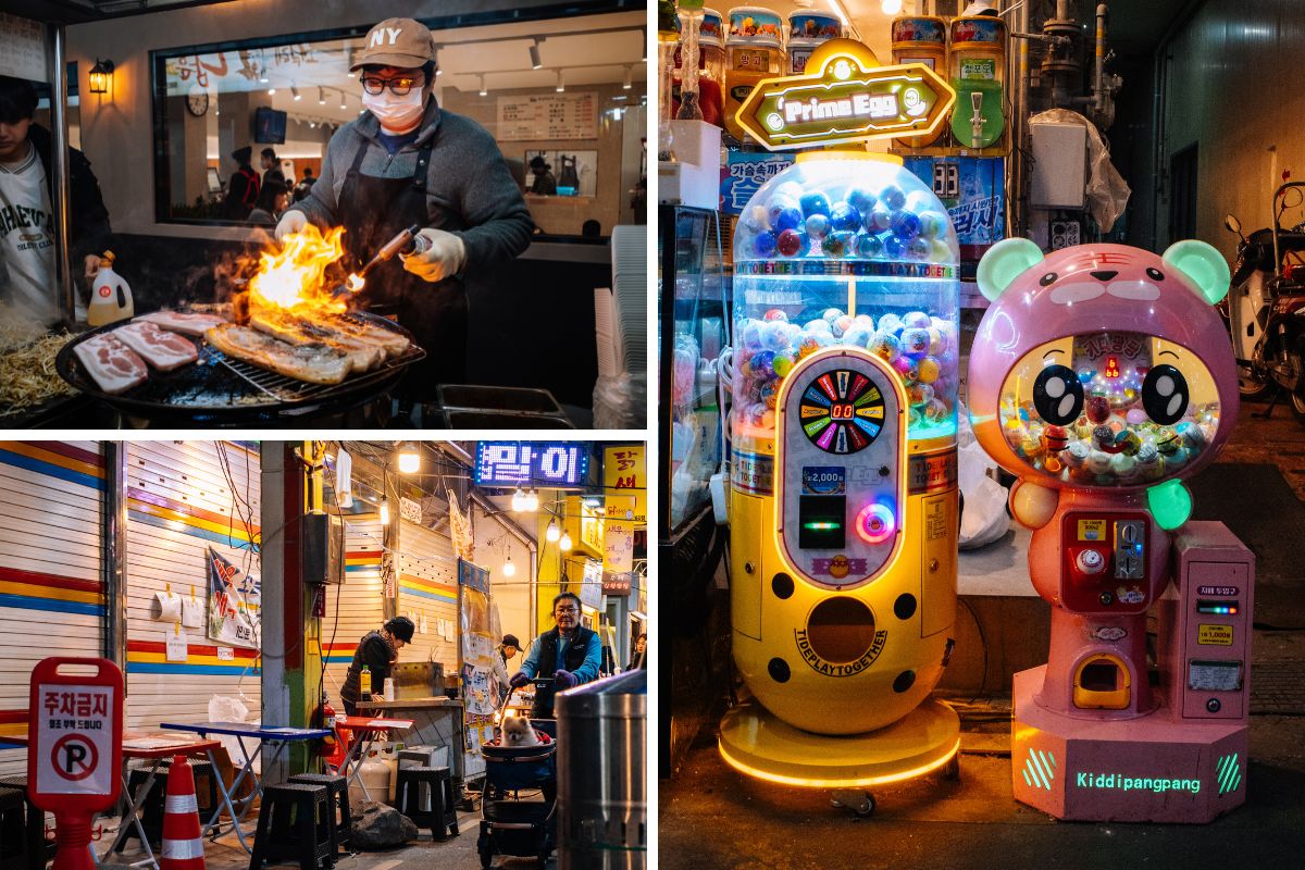 This market is known as Seoul’s busiest food alley with about 200 food stalls. Once you navigate your way through the silk, satin and linen wholesale stalls you will be greeted by the inviting sound and smells of deep-frying delights. Steam billows from all corners and the happy chatter of patrons huddled together on narrow benches enjoying nokdu bindaetteok (mung bean pancakes) made for one of my favourite experiences in Seoul. This crowded and slightly pricey market is often labeled as a tourist trap, but don’t let that deter you, its popularity isn’t by coincidence. Our highlights were seeing Cho Yonsoon (from the Netflix series Street Food: Asia) in action in her signature pink shirt at her kalguksu (knife-cut noodle) stall and eating my first hotteok (sticky brown sugar-stuffed fried pancakes). If big crowds aren’t your thing I would suggest Mangwon Market. Slightly cheaper, not so busy and recommended by locals.
