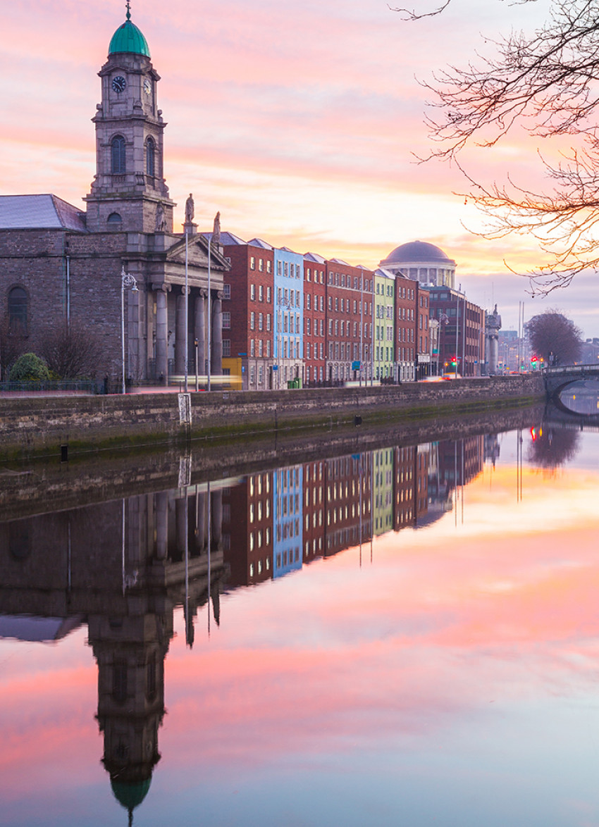 Dublin is a city of two halves (the northside and the southside) and the Liffey provides a natural dividing line before opening out onto Dublin Bay. Compact and flat, the city centre is very walkable, with good public transport links to outer suburbs and along the coast by bus, LUAS (tram) and DART (rail).