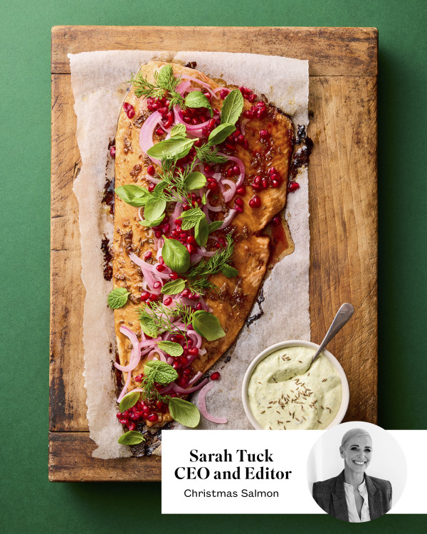 It is tradition in my family, that I do the Christmas hosting, which suits me perfectly! I love nothing more than turning on some Christmas tunes and faffing around the house getting everything ready. For the last 10 years I have been under strict instructions to make the same thing each year — my original roast salmon with pomegranate glaze. This year I can finally mix it up with my new twist on the original, with a herby, garlicky, cuminny sauce that we couldn’t get enough of on shoot day [Christmas Salmon, page 64]. For general nibbling over the Christmas break I’ll be making Melie’s Brown Butter, Amaretto and Prune Mince Tarts with Cinnamon Pastry (page 108), and to go with meaty mains, it’ll be the Fresh Peach, Rocket and Stracciatella Salad on page 80. It looks like it will be Christmas number two without my darling men/boys, with one in London and one in Melbourne — it’s so hard to get my head around the fact that I won’t be giving them big squeezezy hugs so I’ll be doing my best to keep occupied!