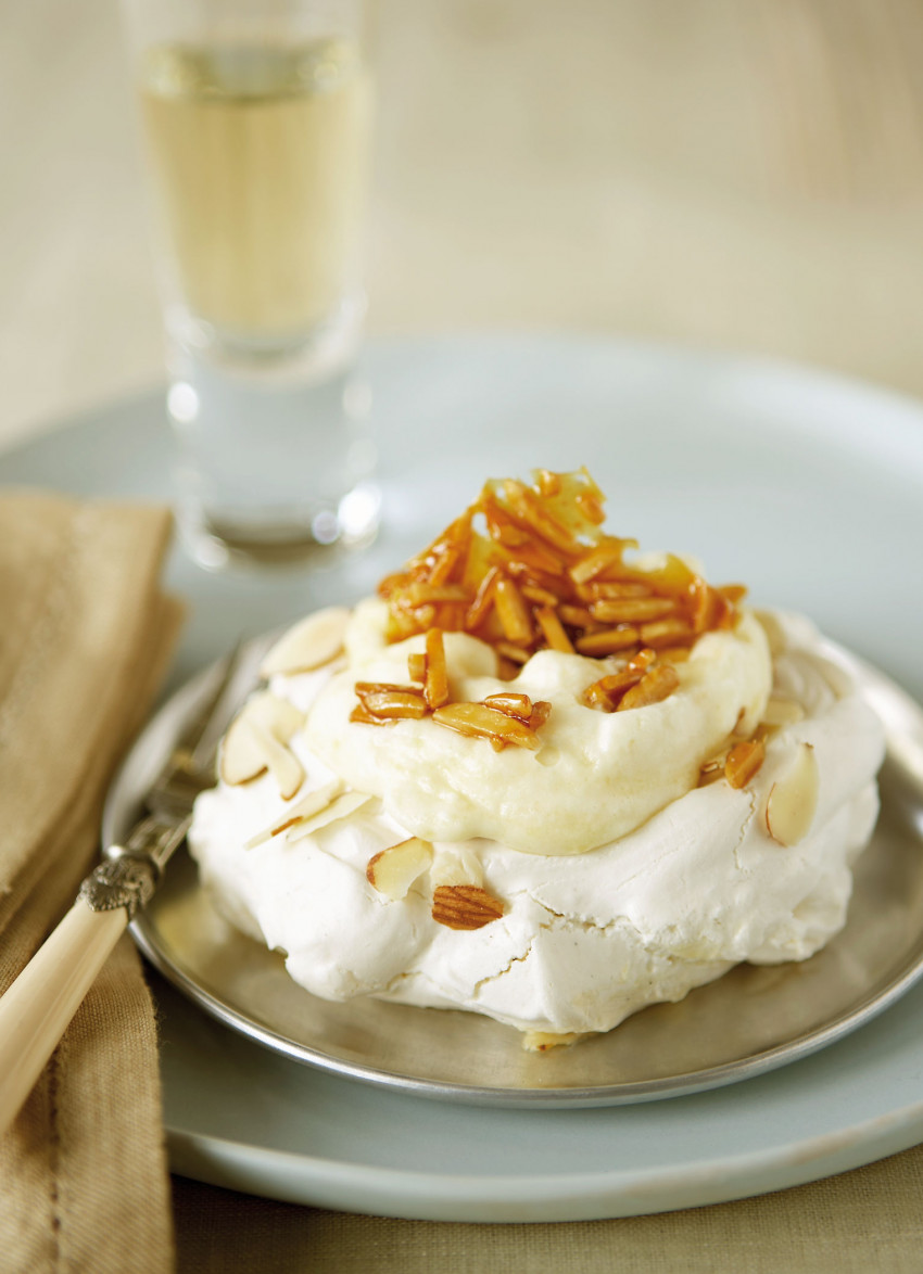 To serve: Place the meringues on serving plates. Fold the lemon curd through the cream and put a large spoonful in the hollow. Scatter with the praline then place a whole shard on top of each one. Makes 4 meringues