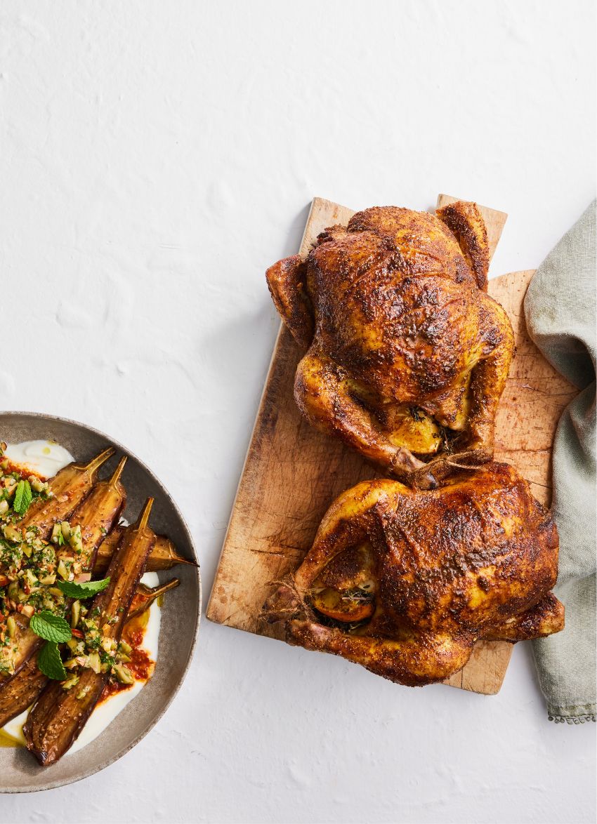 CHICKEN: Place the lemon halves and herbs in the chicken cavities and tie the legs together with kitchen string. Tuck the wings under the breast. Rub the chickens with olive oil and season with salt. Sprinkle the spice mix generously all over both chickens.