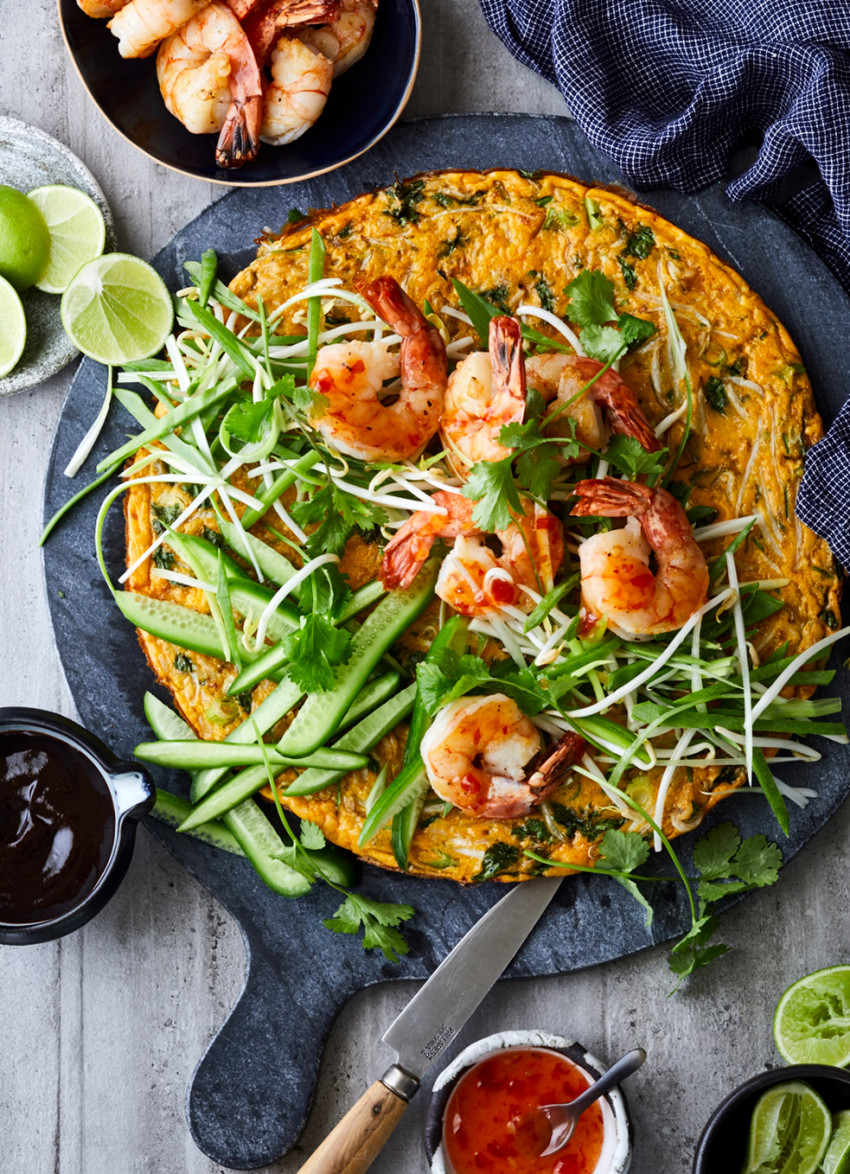 Slide the omelette on to a large board or platter. Top with the salad ingredients and some of the prawns, serving the rest separately. Serve with the lime wedges, hoisin and chilli sauce. Serves 4.