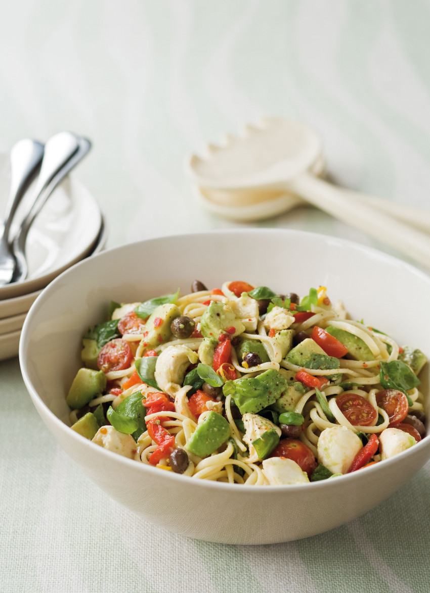 Cook the pasta in a large pot of boiling salted water until al dente. Drain well and add to the bowl of sauce. Toss then fold through the avocado, mozzarella and the basil.