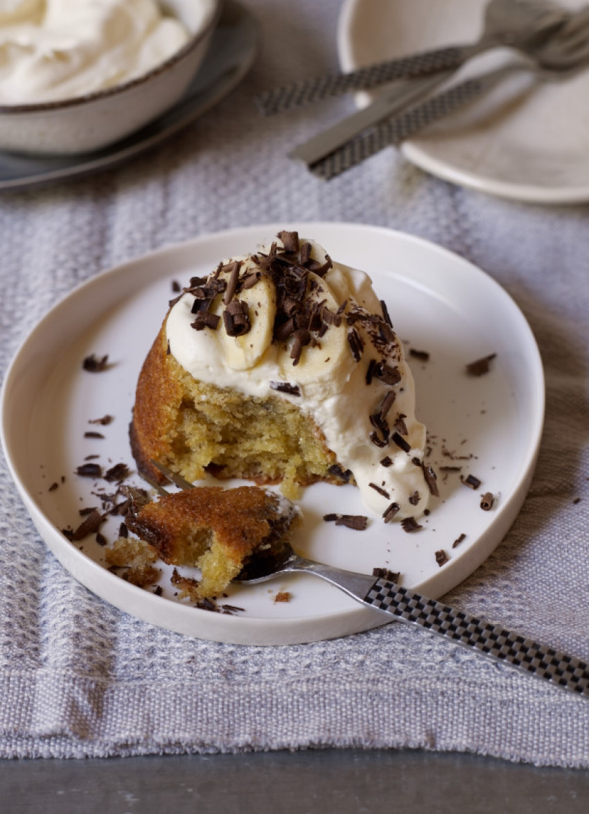 To serve: Top each pudding with a good dollop of cream, sliced banana and a sprinkling of chocolate. Serve immediately.