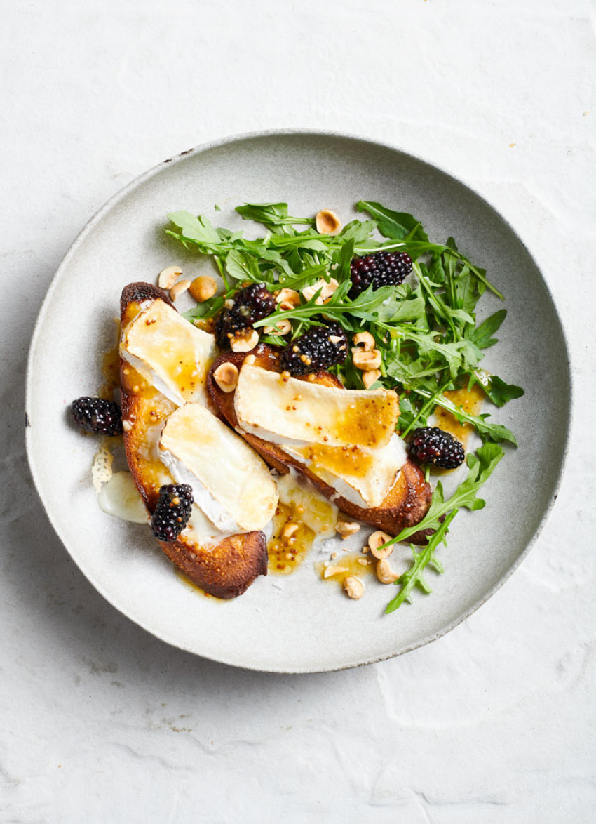 To serve: Divide the rocket between plates and top with the warm cheese toasts. Scatter over the blackberries and hazelnuts then drizzle with some of the dressing. Season with salt and pepper and serve immediately.