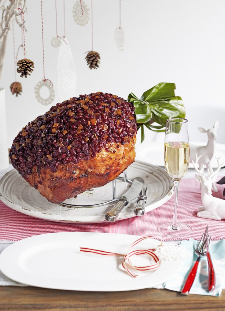 In this recipe, the ham is first glazed to give it that delicious caramelized flavour synonymous with Christmas ham. Then the fruit, having been mixed with the glaze, is pressed all over the ham to give it a luscious, jewel-like finish.
