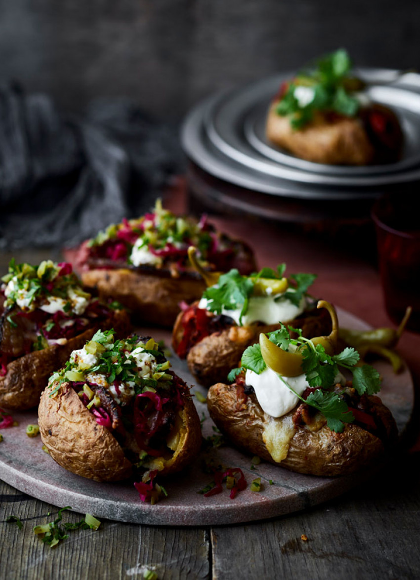 Baked Potatoes with Sliced Pastrami, Red Kraut and Smoky Chilli Beans