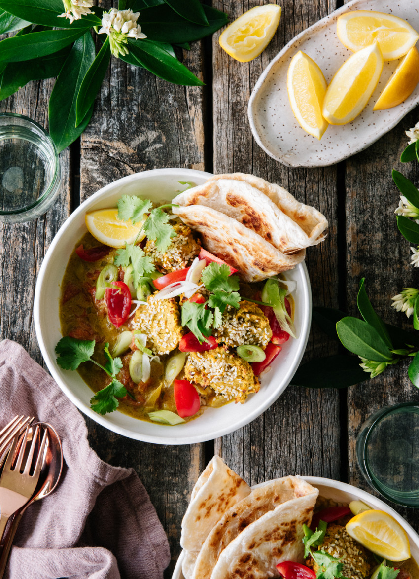 To serve: Spoon the Spiced Coconut and Tomato Sauce into shallow bowls and top with the hot falafel. Serve with warm naan bread and garnishes.