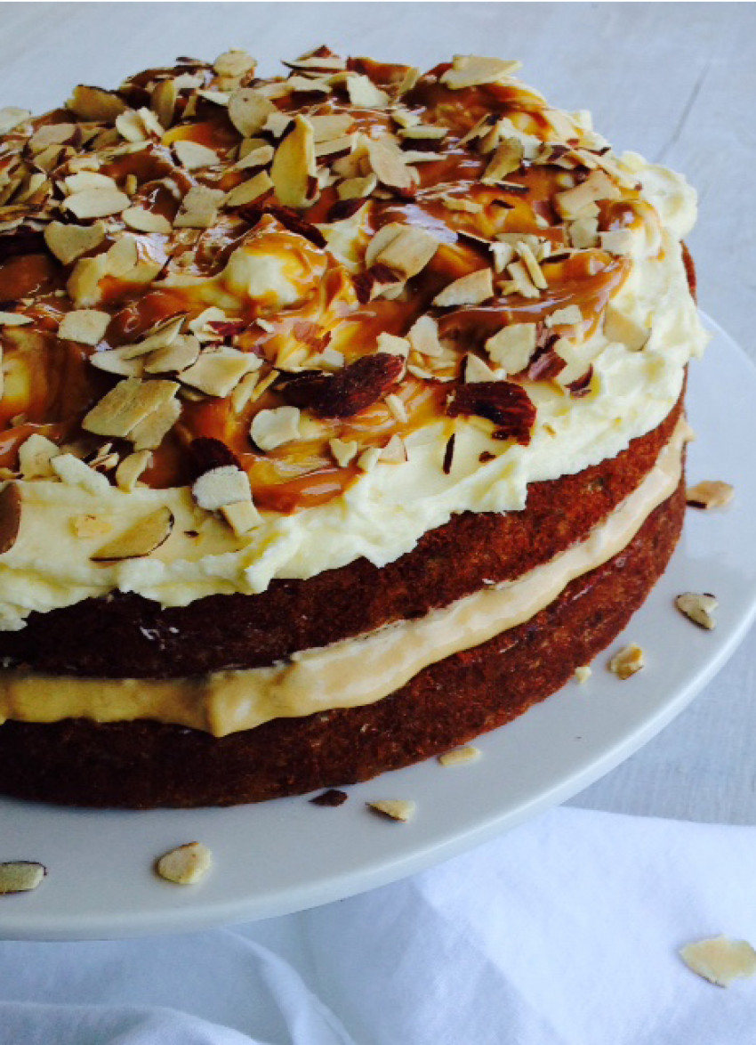 Place the second cake on top and spread with the remaining icing. Spoon the remaining caramel over the icing and swirl together with the tip of a knife. Sprinkle with almonds if using. The unfilled cakes will keep for 3 days in an airtight container. Makes 1 cake.