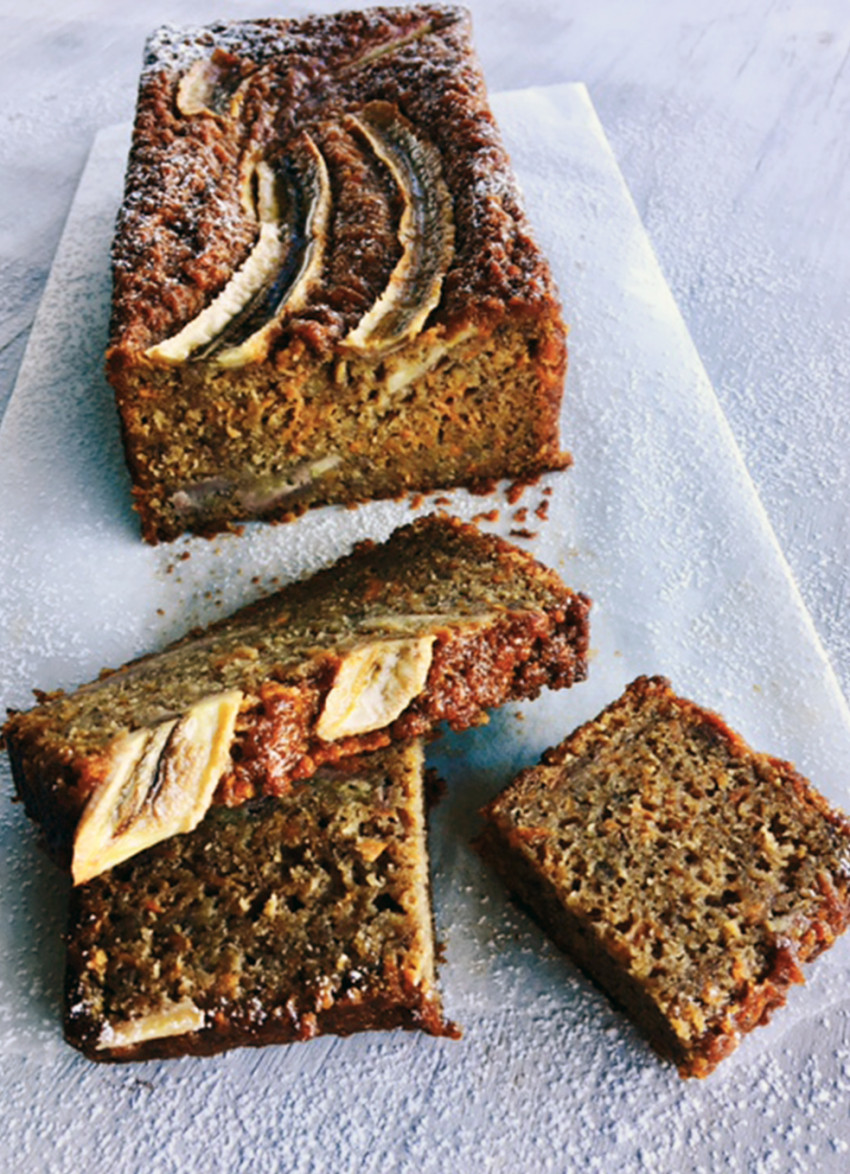 Bake for 30 minutes. Remove from the oven and top with another layer of thinly sliced banana (the first layer will have sunk into the cake batter). Bake for another 30 minutes or until a skewer inserted into the centre comes out clean.