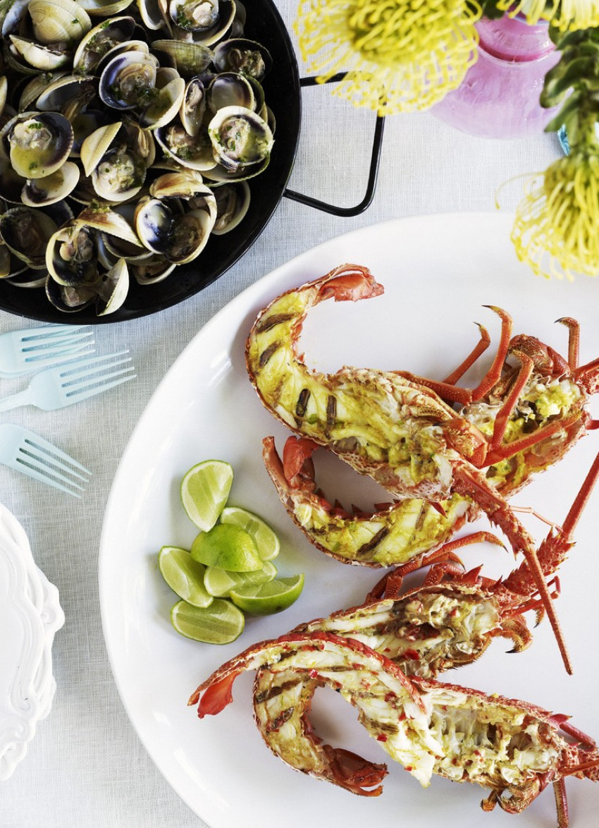 Serve with Barbecued Crayfishand Flavoured Butters: Lime and Red Chilli, Caper and Lemon, and Ginger, Spring Onion and Turmeric.
