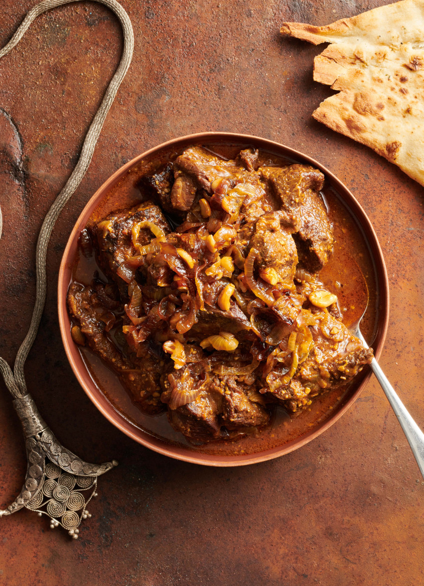 This perfectly spiced and creamy curry is a real crowd-pleaser. The caramelised onions with roasted cashew nuts are the crowning glory and you need lots of warm naan bread when serving.