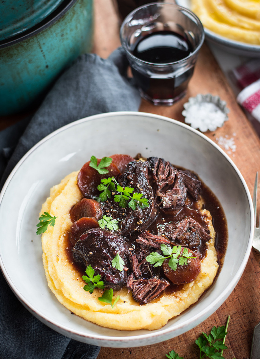 A great dish for a cold winter's night. The beef cheeks are slow cooked in a rich red wine sauce until tender and falling apart. Served with creamy parmesan polenta and a glass of red wine.