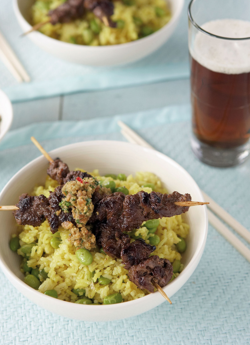 Beef Skewers with Fragrant Rice and Peanut Chutney
