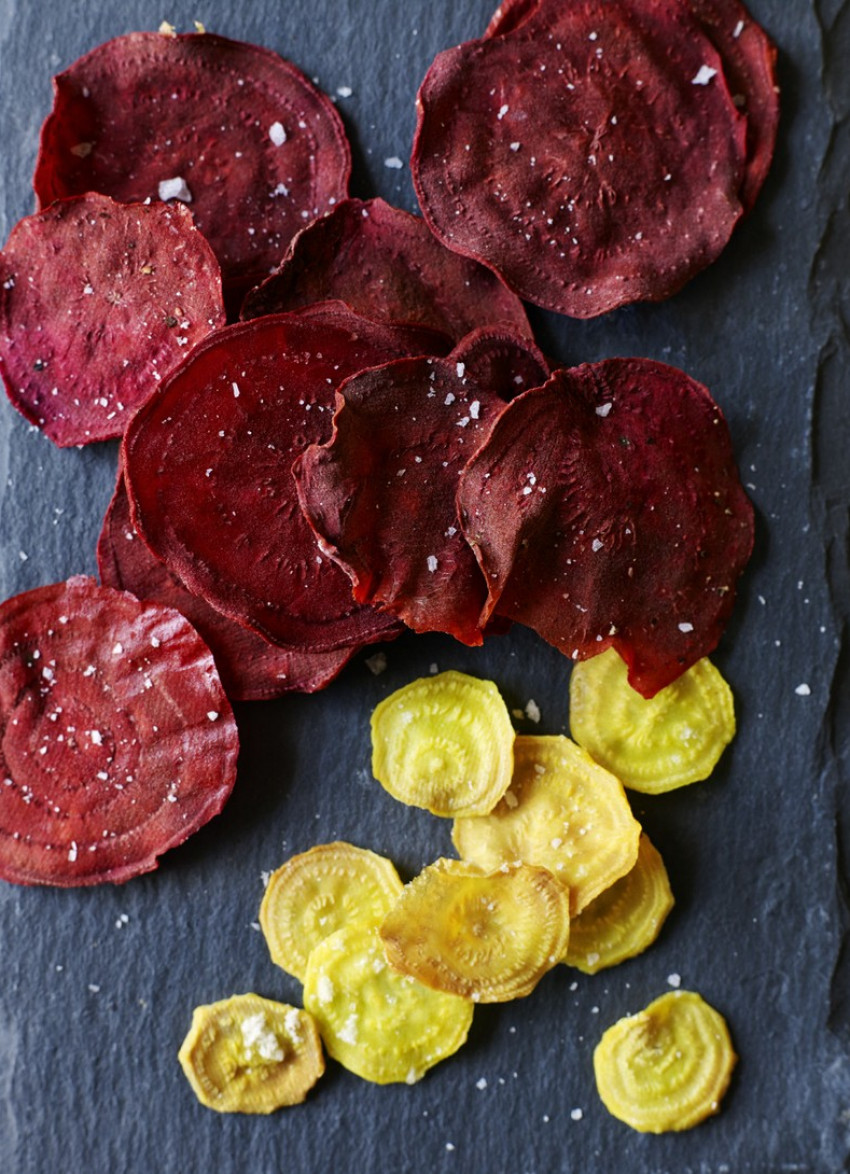 Season with salt and pepper and bake for 20 minutes. Carefully turn the slices over and bake for a further 20 minutes or until they are dry. Cooking times depend on the freshness and thickness of the beetroot chips. They will become very crisp on cooling. Store the beetroot chips in a sealed container for 5 days. Makes plenty