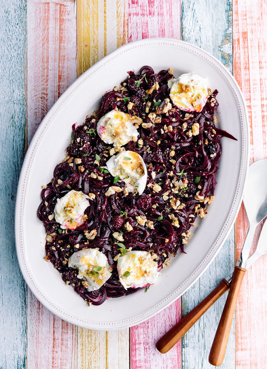 Heat the olive oil in large sauté pan and cook the onion and fennel seeds for 5 minutes. Add the beetroot noodles with a good pinch of salt and cook for about 10 minutes until crisp and tender, turning often and adding a splash of water so the pan doesn’t dry out. Keep having a taste until they’re cooked to your liking. Add the garlic and balsamic vinegar and let it bubble up then add the blackberries and cook for about 2 minutes or until they just start to soften, adding a splash of water if the pan starts to get dry. Set aside to cool.