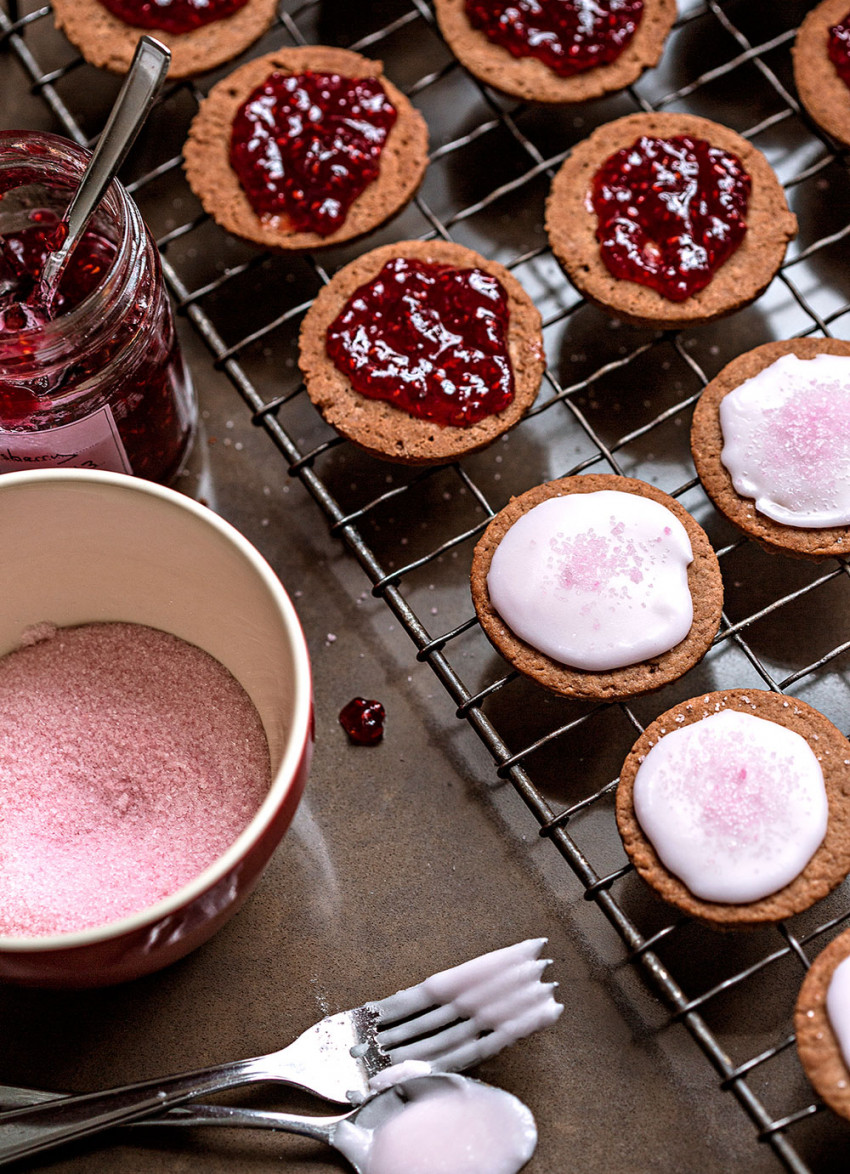 When biscuits are cold, ice half of them and sprinkle with coloured sugar. Place 1 tablespoon of raspberry jam in the centre of the baking-tray side of the remaining biscuits. Top with an iced biscuit.