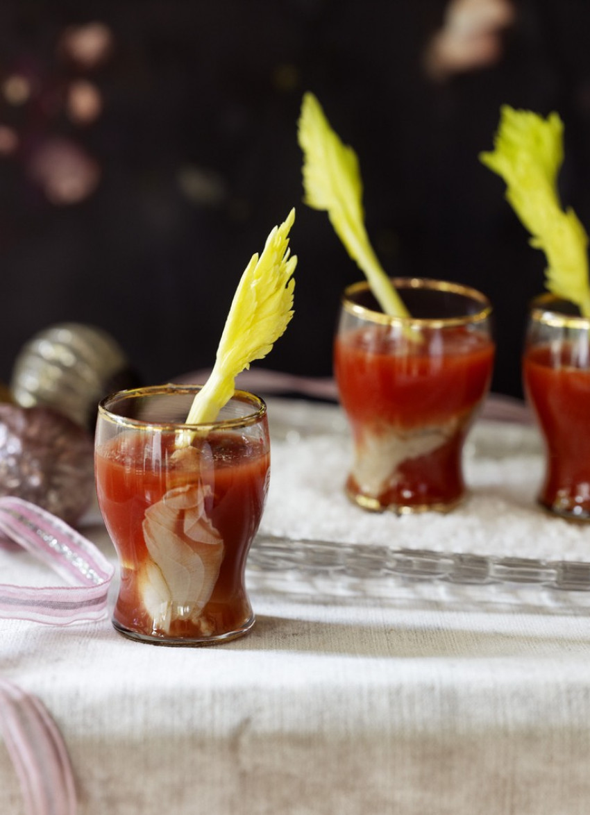 To serve: Place an oyster in each glass and pour over the Bloody Mary mixture. Garnish with a small stick of celery if using and serve immediately. Makes 12