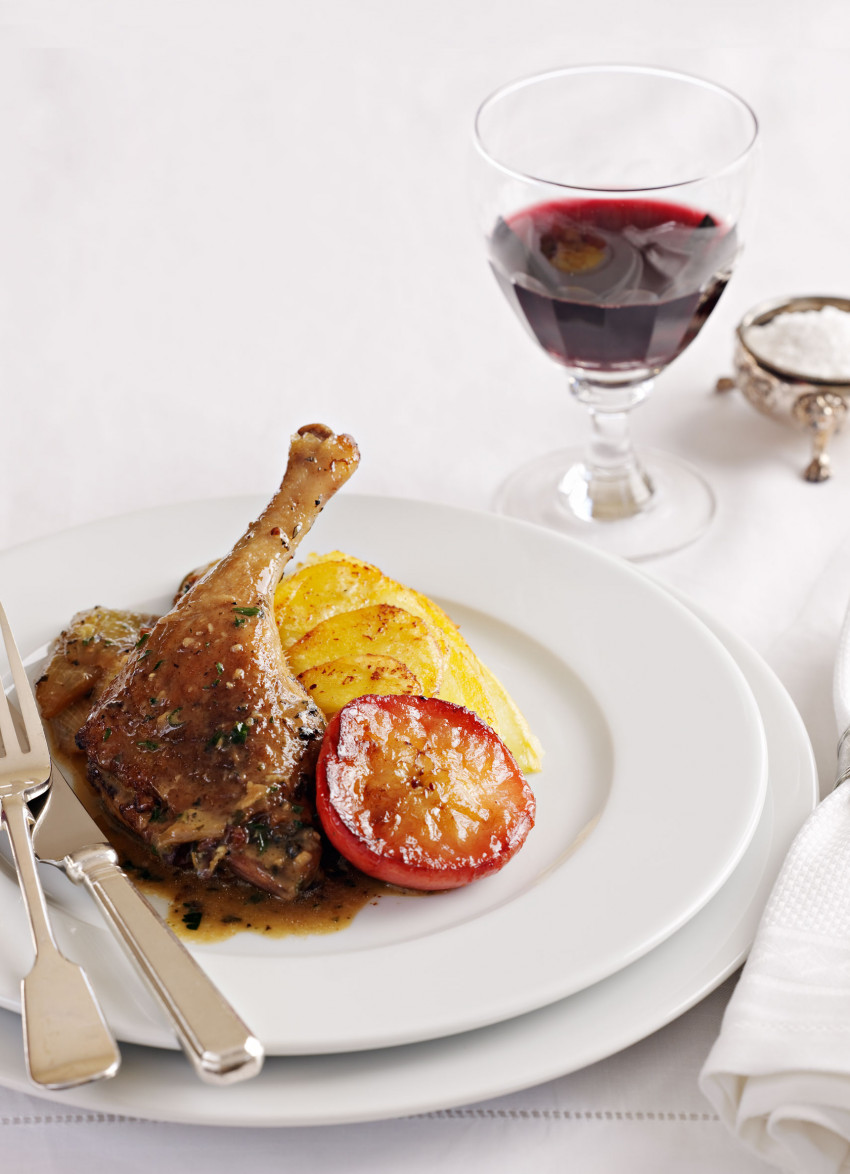To serve: Place a wedge of Potatoes Anna on each plate and top with a portion of duck and one or two halves of apple. Spoon over the sauce.