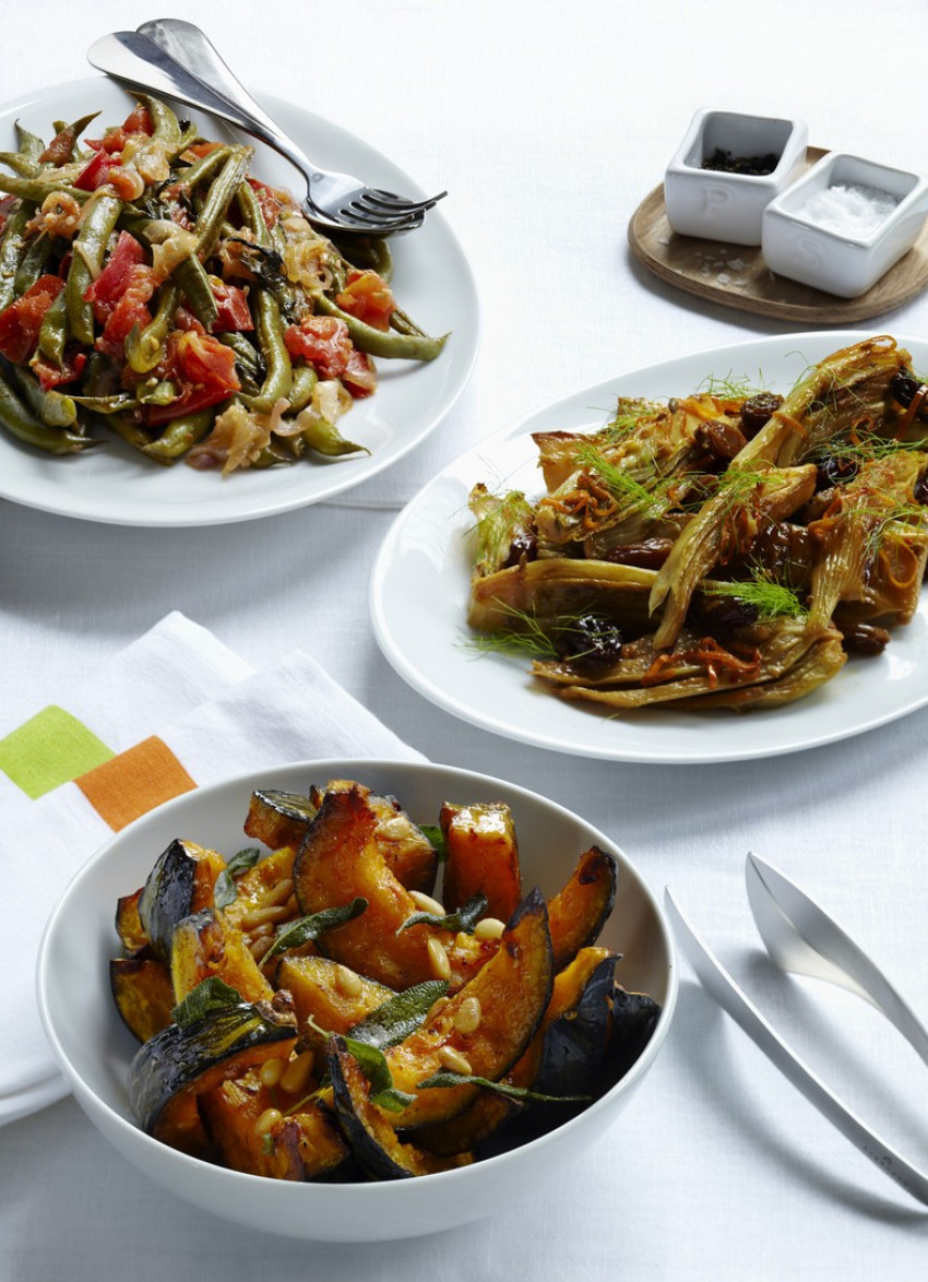 Trim and wash the fennel, reserving the feathery tops. Cut in half through the centre from the top then cut each half into two or three wedges. Heat the olive oil in a large sauté pan and brown the fennel on all sides. Add the fennel seeds, chilli flakes, garlic and wine. Let the wine bubble up for 1 minute then add the raisins, orange juice and stock. Season. Simmer uncovered until the fennel is tender and the liquid is reduced to a glaze, turning the fennel occasionally.