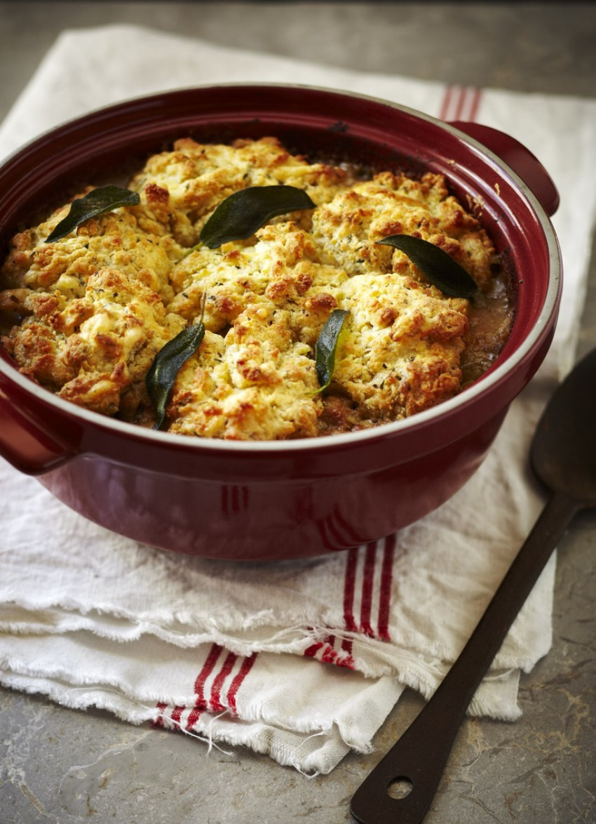 Place large spoonfuls of dough on top of the pork and brush with the melted butter. Bake for about 20 minutes until the cobbler is puffed and golden and cooked through. If using the sage leaves, brush with butter and place on top of the cobbler for the last 5 minutes of cooking.