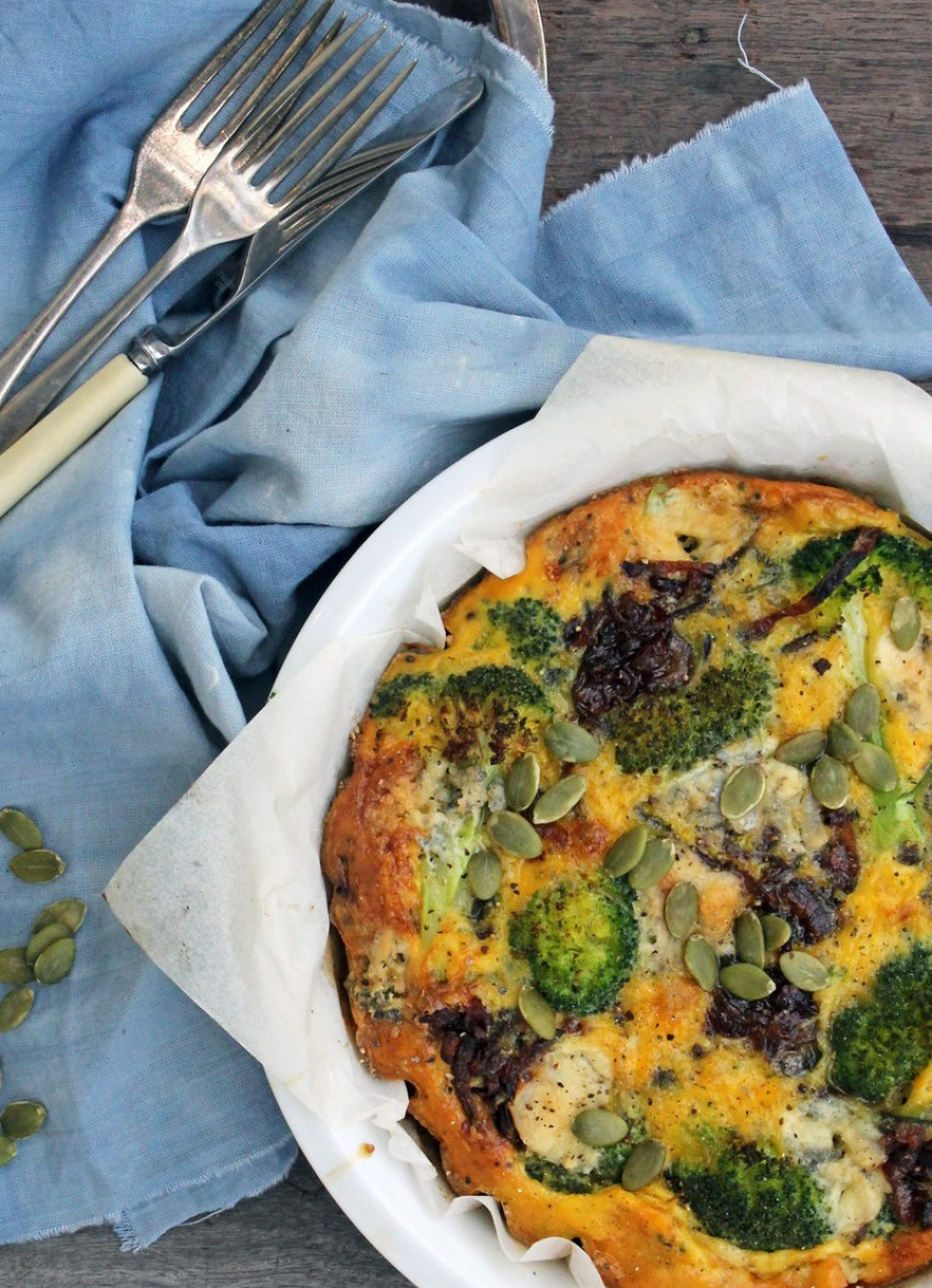 Season the lightly beaten egg with salt and pepper and pour over. Arrange the remaining broccoli on top and lightly push into the egg mixture. Crumble over the remaining blue cheese and dollop the rest of the caramelised onion.
