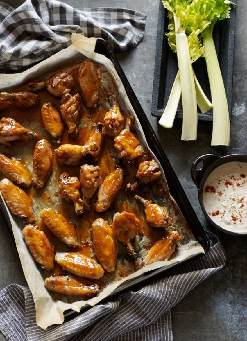 Baked wings doused in a hot and spicy sauce go perfectly with blue cheese dip and fresh, crunchy sticks of celery. I don’t use oil on the wings, as they have enough natural fat.