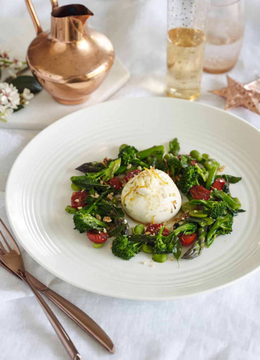 This is a delicious all vegetable meal that really looks the part for Christmas Day with its striking green, red and white colours. Instead of serving as a main for four, you could replace the burrata with small balls of buffalo mozzarella and serve eight as a starter.
