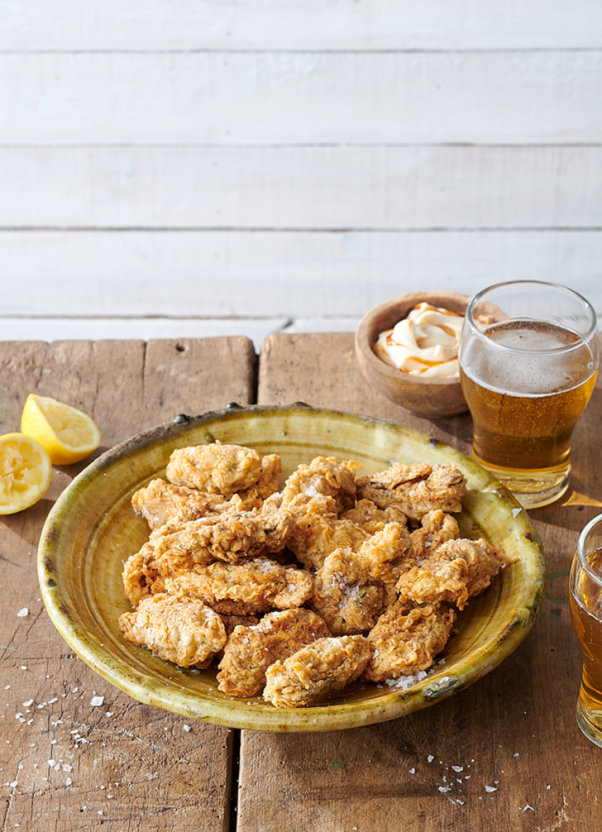 Toss the mussels in the first lot of seasoned flour, shaking off the excess. Dip the mussels the egg white then toss in the Cajun flour so they’re really well coated.