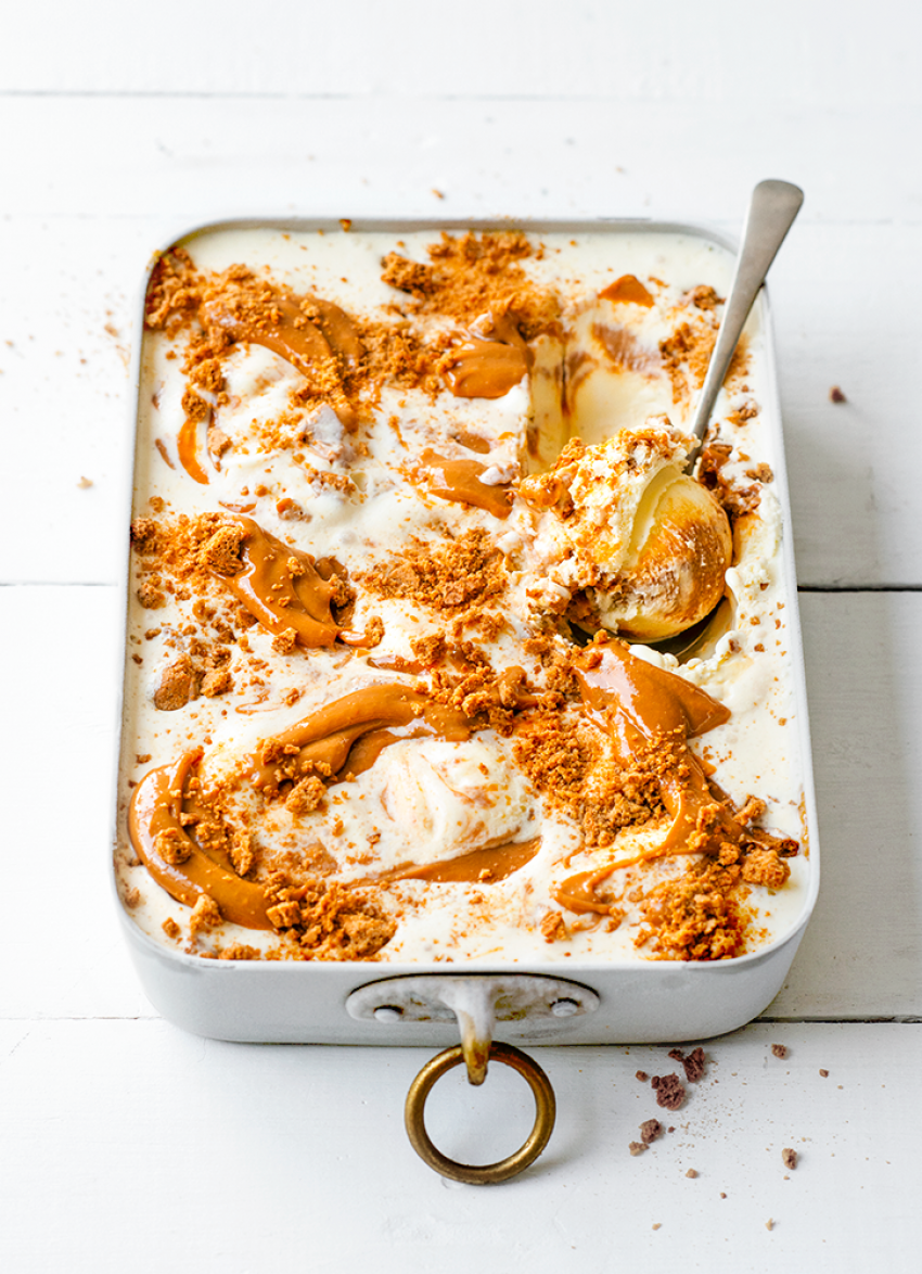 Use a large spoon to make pockets in the ice cream and drop in three-quarters of the caramel condensed milk and gingernuts. Use a flat knife to swirl the flavourings through, then top with the remaining caramel condensed milk and gingernuts. Freeze for at least 3 hours before serving. Serves 8-10