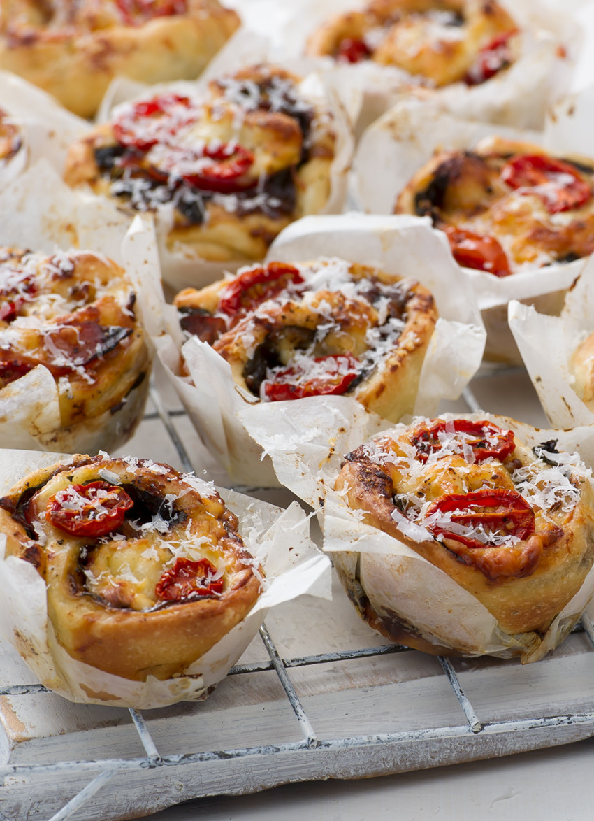 Using a sharp knife, trim off the ends then cut into 12 even pieces and place cut side up in the muffin tin. Brush with olive oil then tuck two tomato halves into each roll and top with a generous grating of Parmesan and a sprinkle of sea salt and pepper.