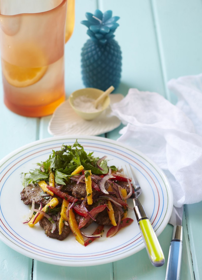 If papaya isn’t available, use mango to make this lovely fresh topping. Thin slices of pork fillet can replace the pork medallions.