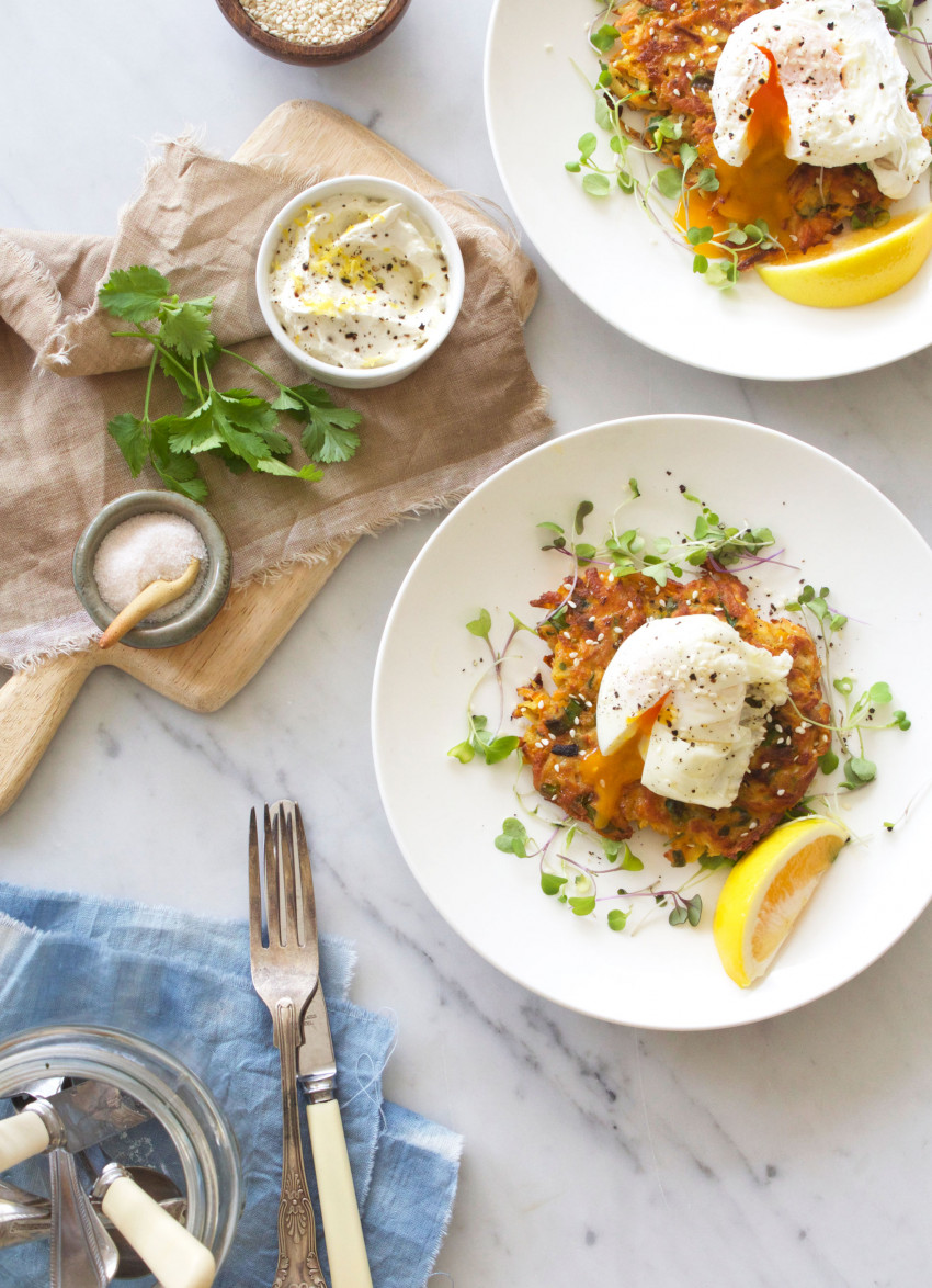 To serve: Place a rosti on each plate, top with the poached eggs and garnish with seeds and microgreens and a lemon wedge. Serve immediately with labne on the side.